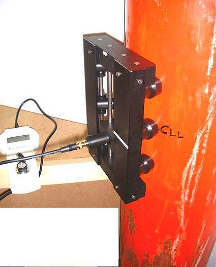 The Robo Transducer system is designed to automatically fit cylinders with a diameter of 6”/150mm or more up to a flat surface. Six powerful magnet heads rotate automatically to fit the curve of the cylinder and hold the Robo Transducer in position.
